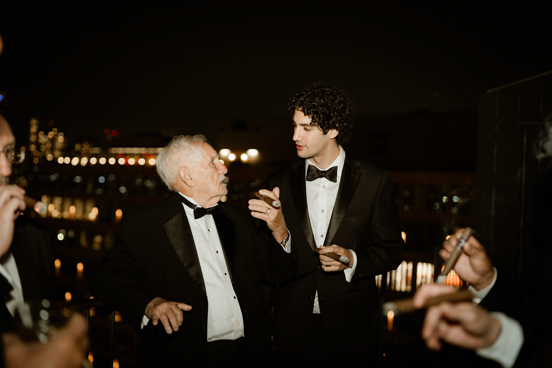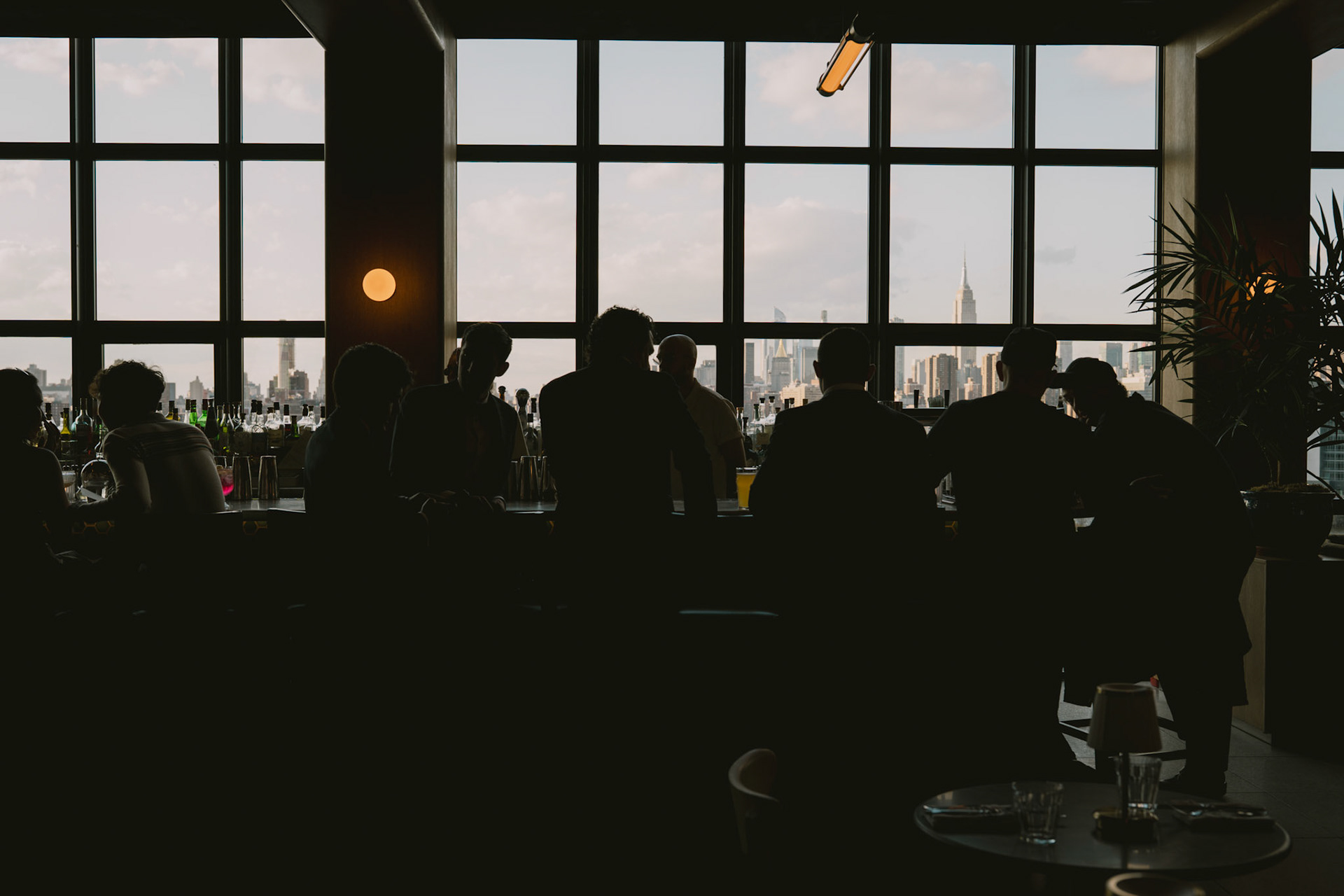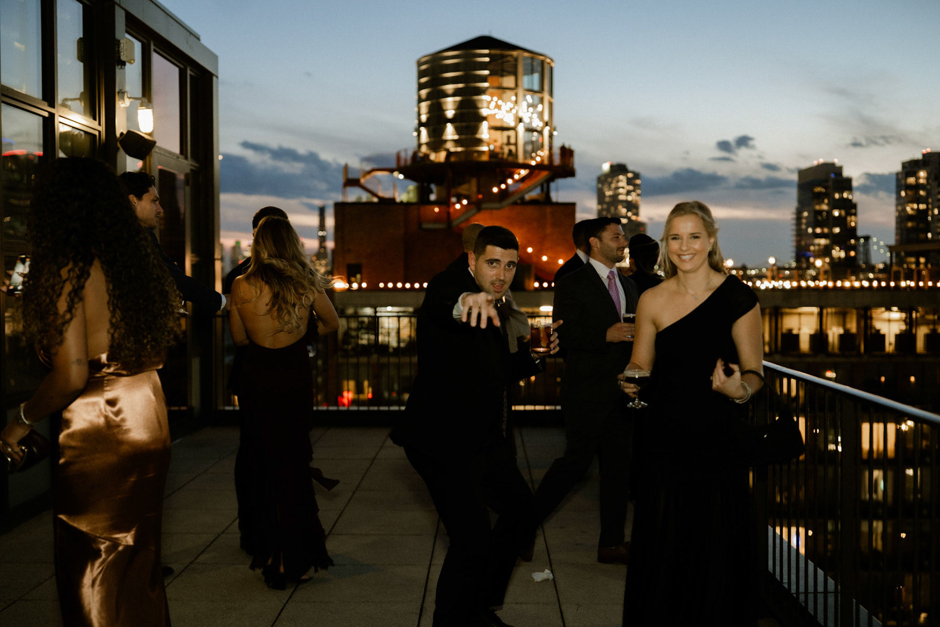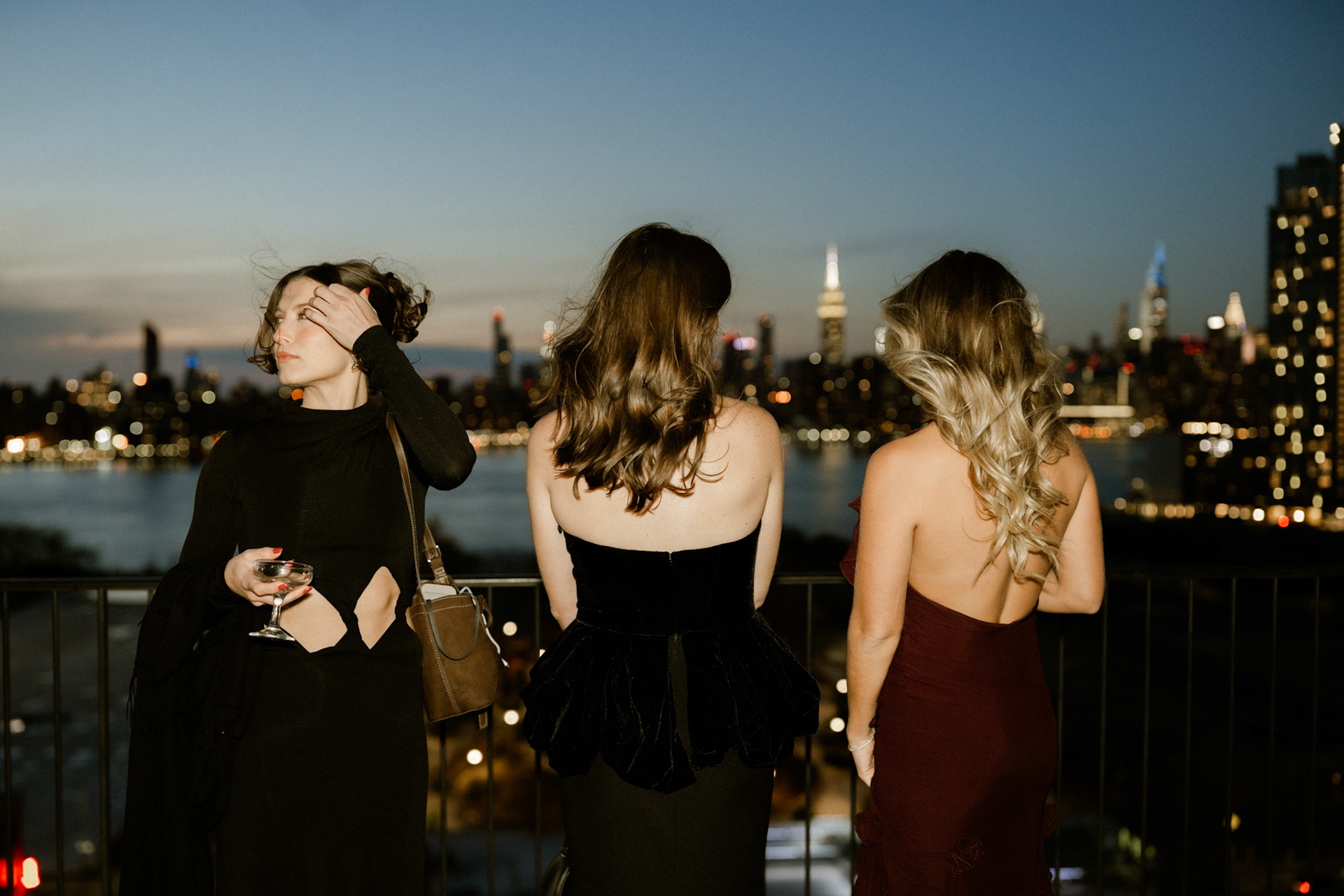 cocktail hour on the penthouse roof against the manhattan skyline