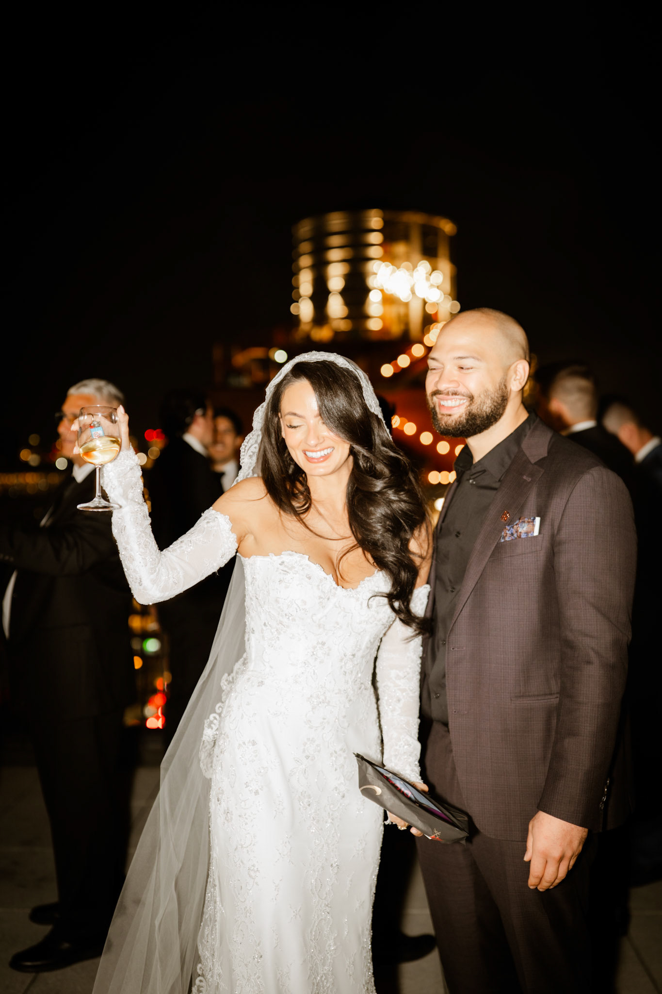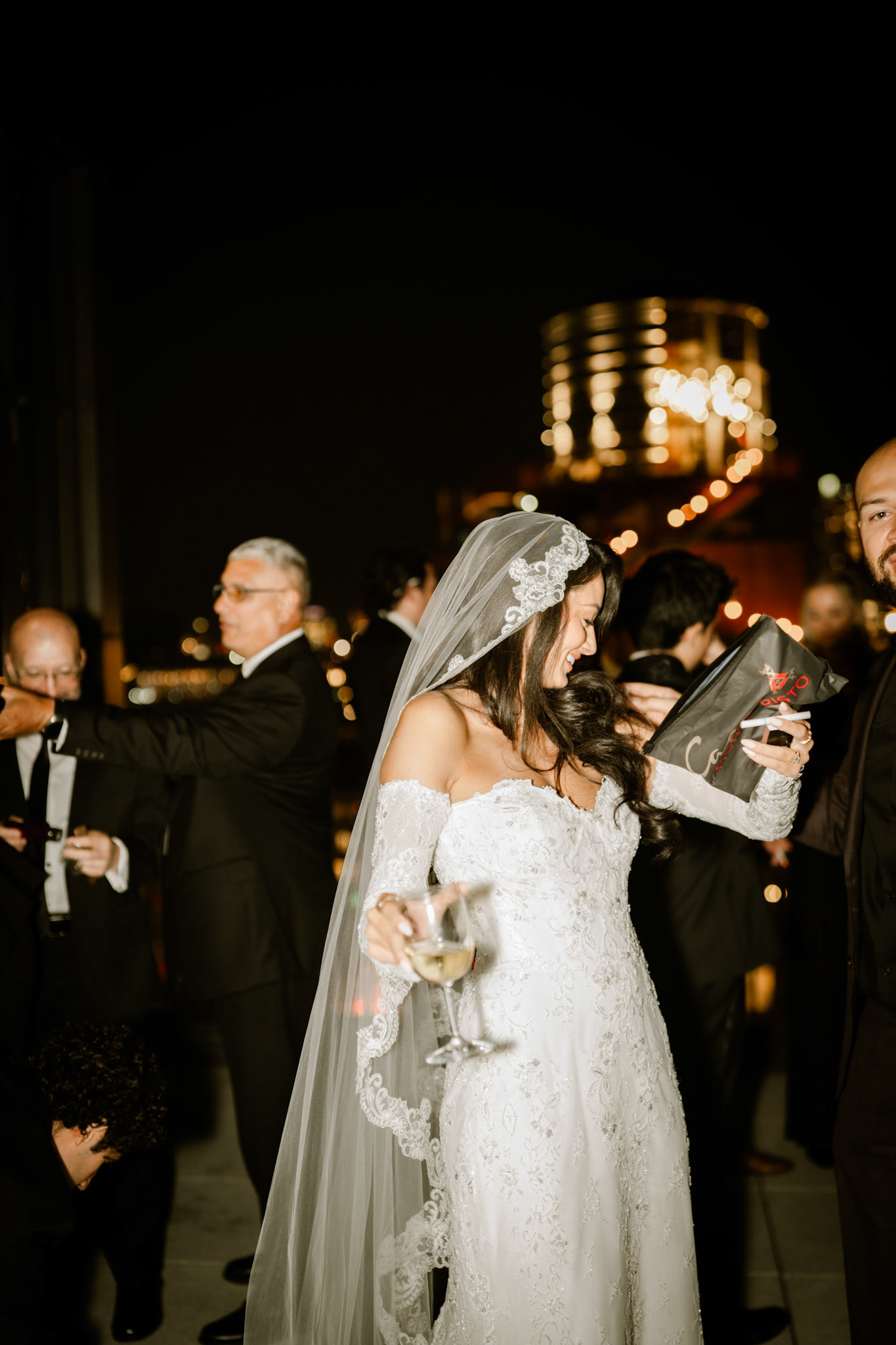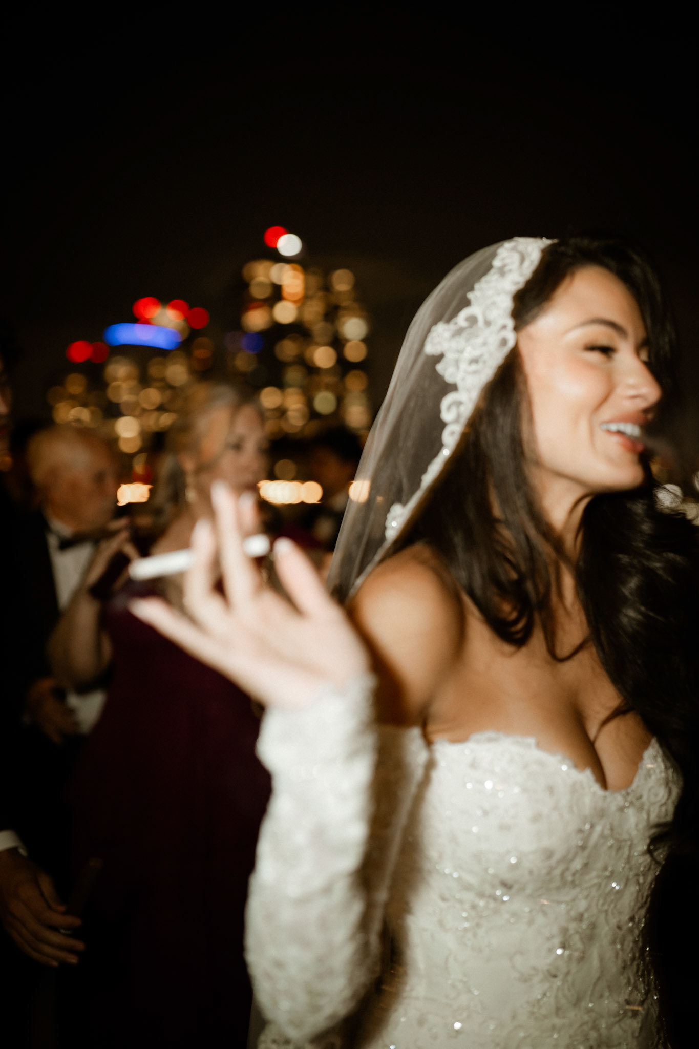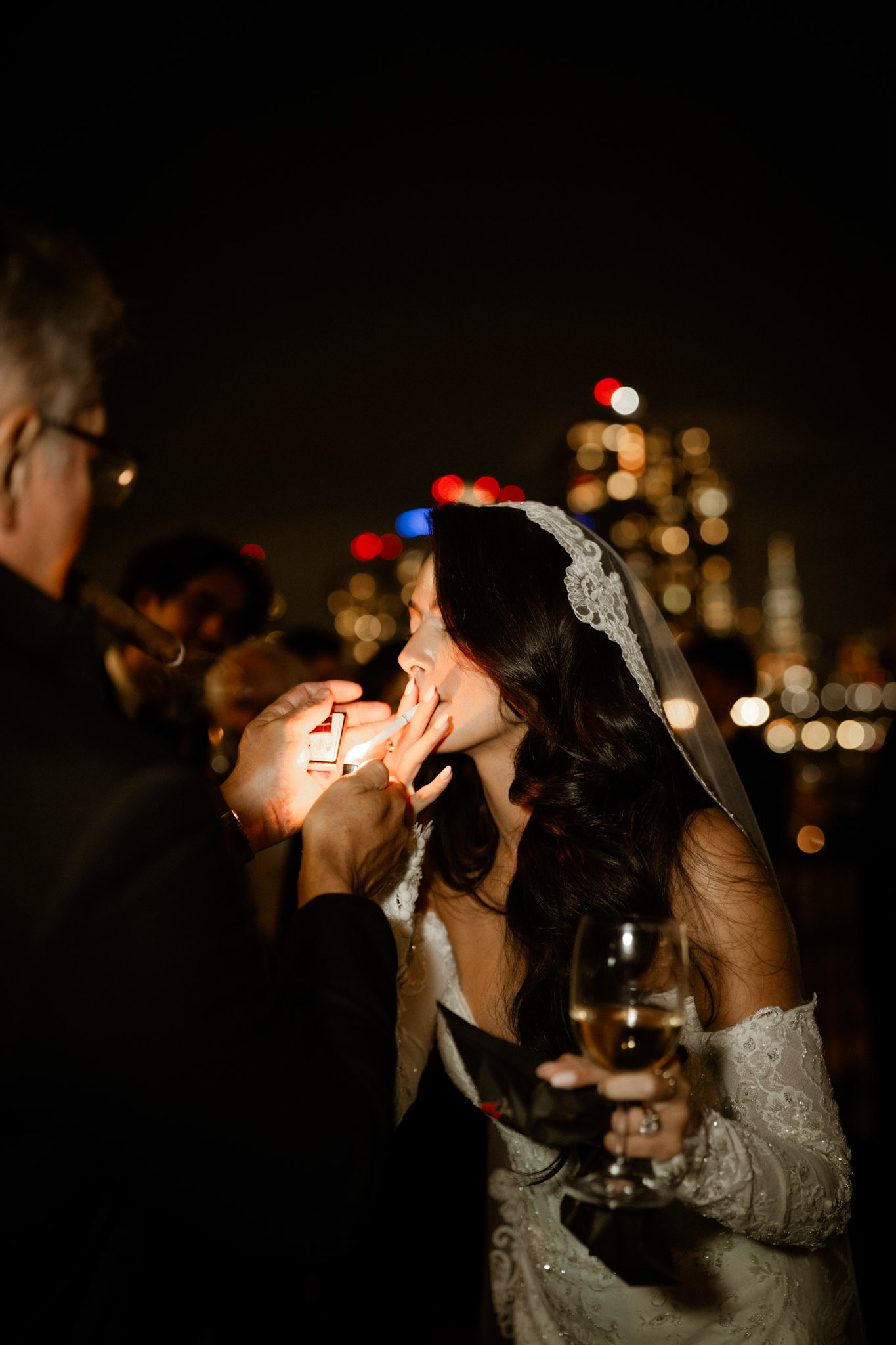 cocktail hour on the penthouse roof against the manhattan skyline