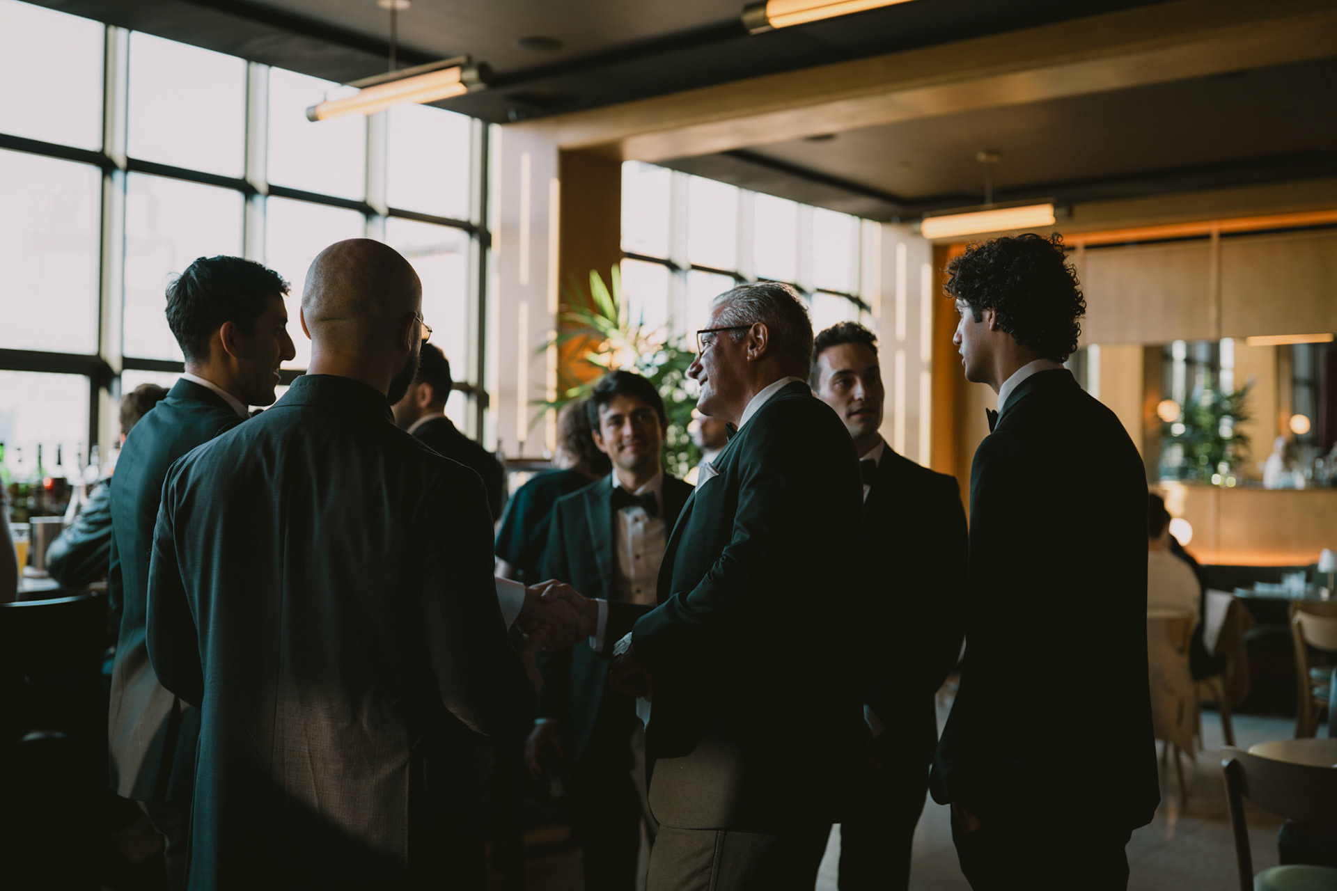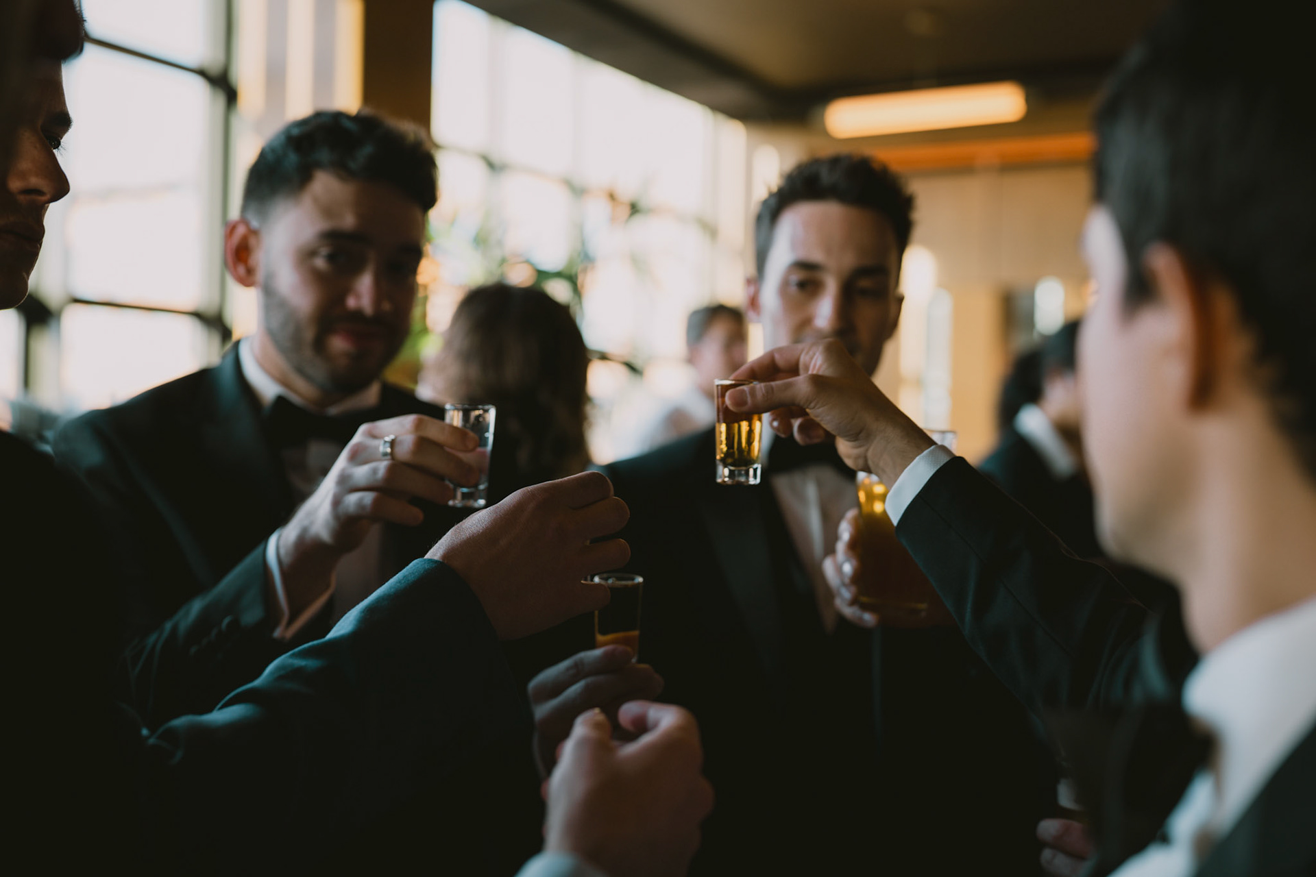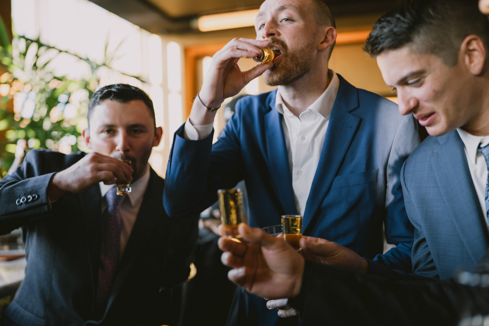 Groomsmen loosening up before the ceremony in Bar Blondeau