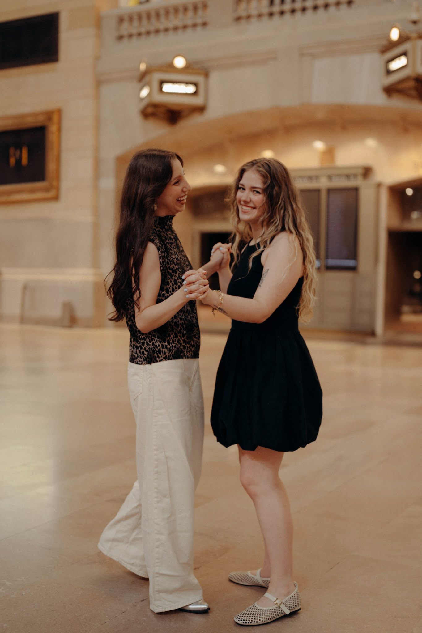 Kara and Celina embrace each other amidst the hustle of America's most iconic train station.