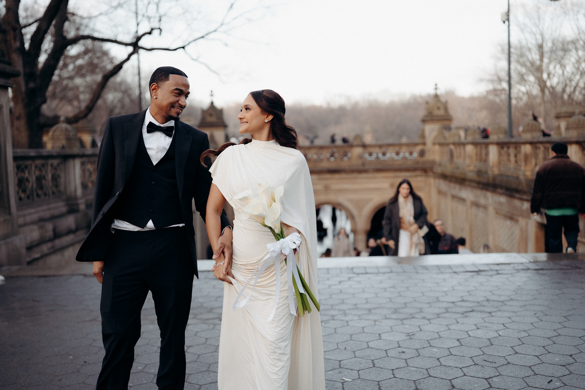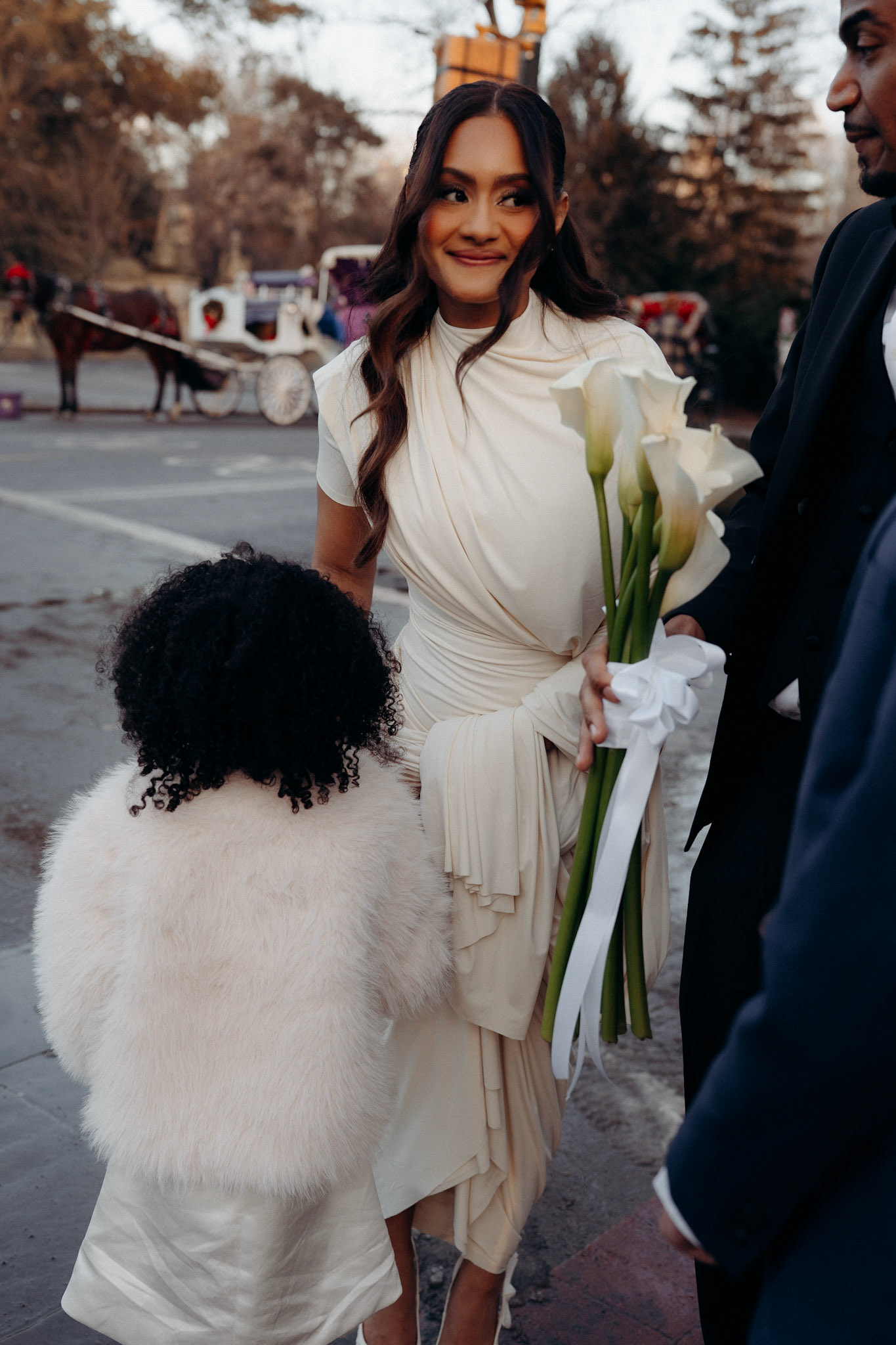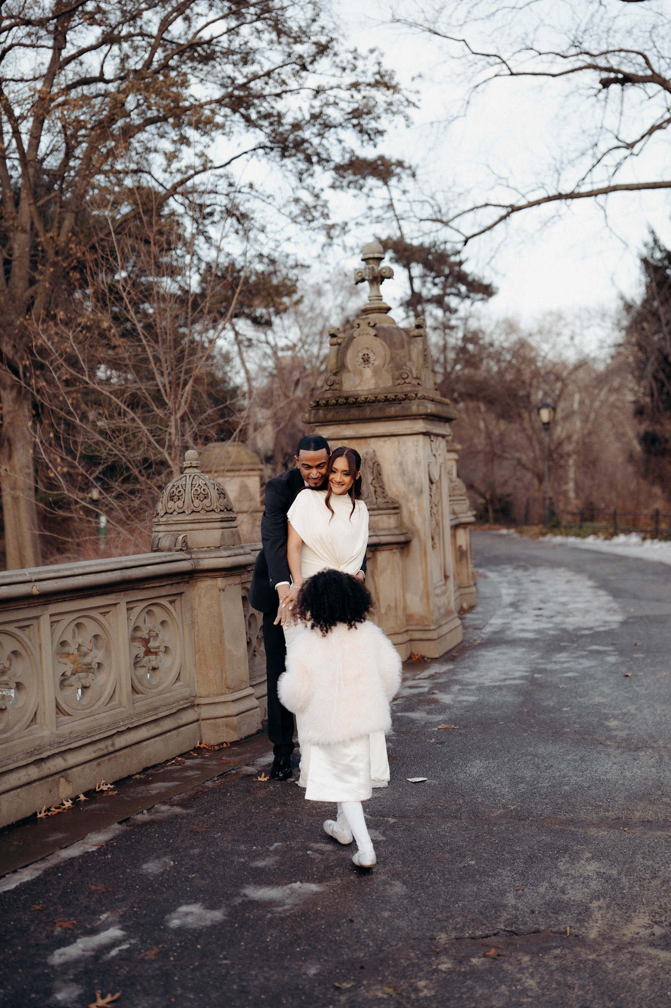 Yudelka & Rafael had a private wedding ceremony with just their son and daughter at Manhattan City Hall before meeting me at the Bethesda Fountain in Central Park for portraits. Yudelka's incredibly chic dress couldn't help but evoke Lady Liberty, delicately accented with a bouquet of calla lilies, while Rafael provided stunning contrast with his tailored black suit. The couple fit perfectly in the wintery Central Park scene.